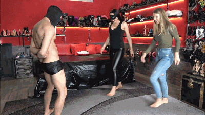Von allen Seiten prasseln die Tritte seiner Herrinnen in die Eier des Losers. Für das Ballbusting muss sich der Sklave breitbeinig vor seine Herrinnen stellen und muss die doppelte Domianz über sich ergehen lassen. Die CBT ist seine Bestrafung für ungehorsam. Die beiden sadistischen Herrinnen haben großen Spaß daran, den Loser leiden zu sehen und genießen die Kontrolle, die sie über den Sklaven haben. Das die Herrinnen bei dem Eier-Treten die Bälle des Losers crushen, ist ihnen egal, hauptsache, sie haben Spaß.